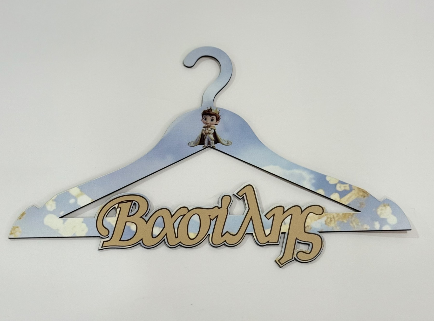 Κρεμάστρα ξύλινη με ψηφιακή εκτύπωση και το όνομα του παιδιού, συνδυασμένη με το θέμα της βάπτισης.